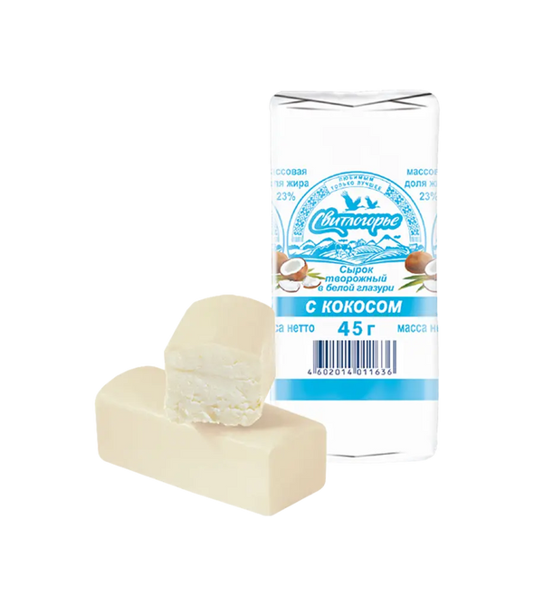 Curd Cheese Bar with Coconut — a delicate curd dessert with coconut flakes, coated in white chocolate glaze. Light tropical flavor and a smooth texture.