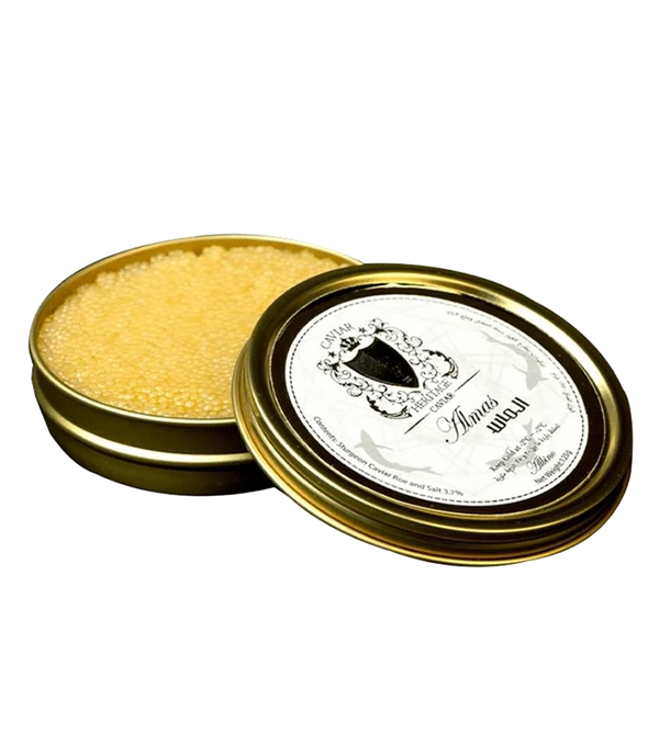 Albino Almas Caviar — a rare delicacy from albino sturgeon with golden eggs, a delicate texture, and an exquisite creamy-nutty flavor.