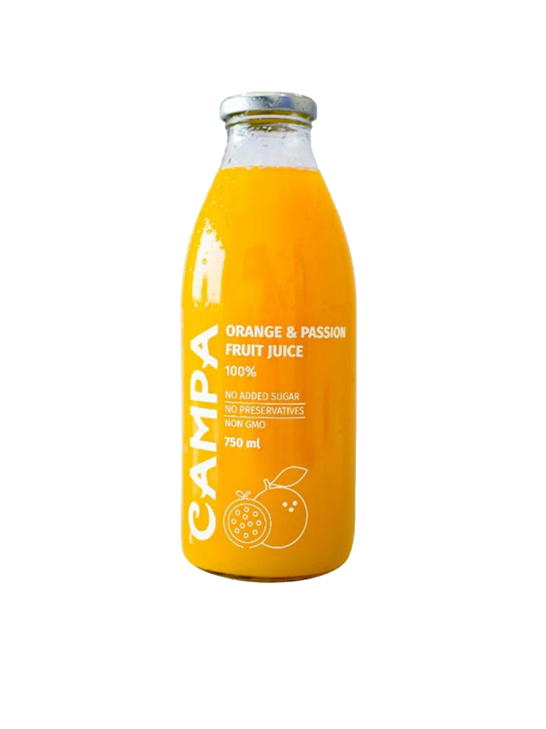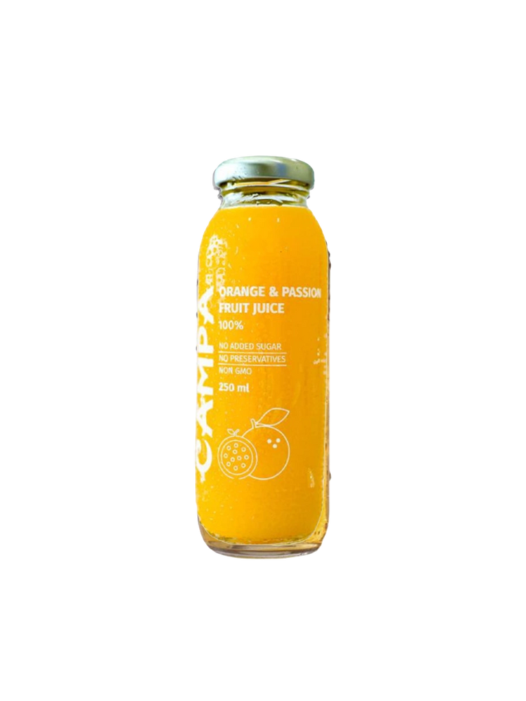 Georgian Campa Orange-Passion Fruit Juice 100% — a natural fruit drink with a rich tropical flavor. The combination of juicy orange and aromatic passion fruit creates a harmonious balance of sweetness and tartness.