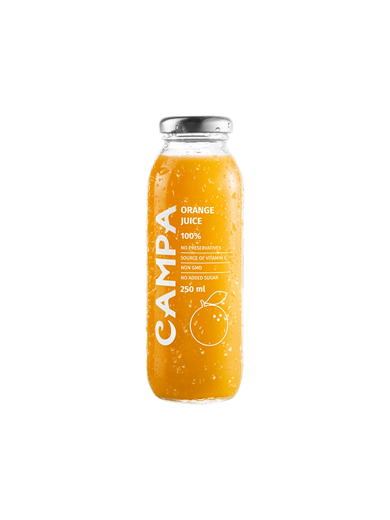 Georgian Orange Juice Campa 100% — natural juice from concentrate without added sugar and preservatives. Refreshing flavor of ripe oranges in a convenient 250 ml format for daily consumption.