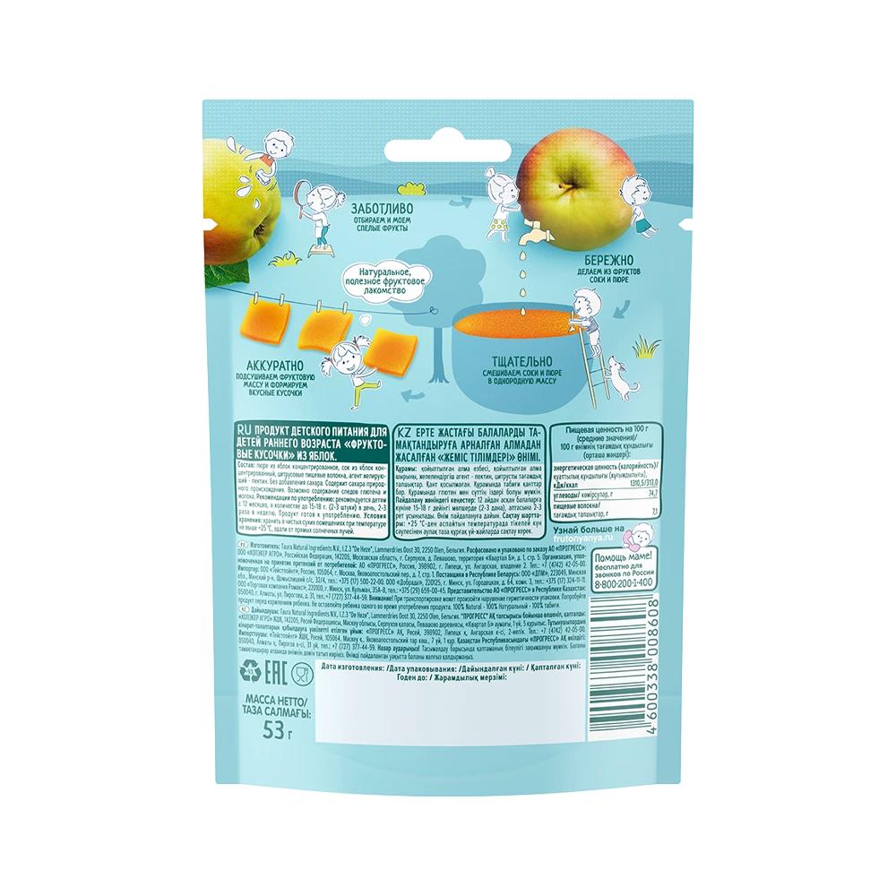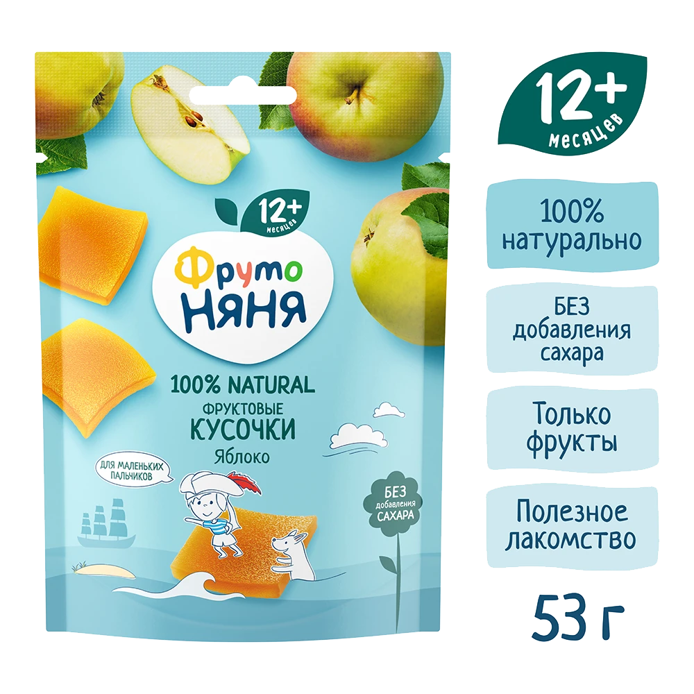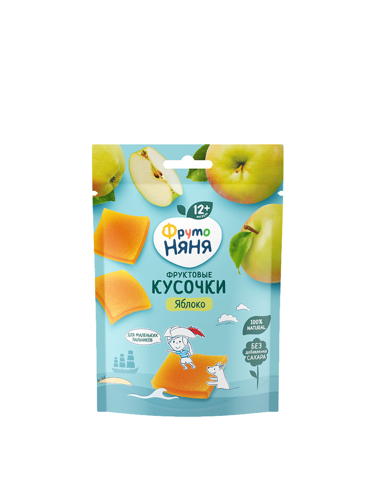 Fruit pieces “FrutoNyanya” made from apple — a natural fruit treat for children from 12 months. Made from apple juice and apple puree without added sugar, colorants, or preservatives.