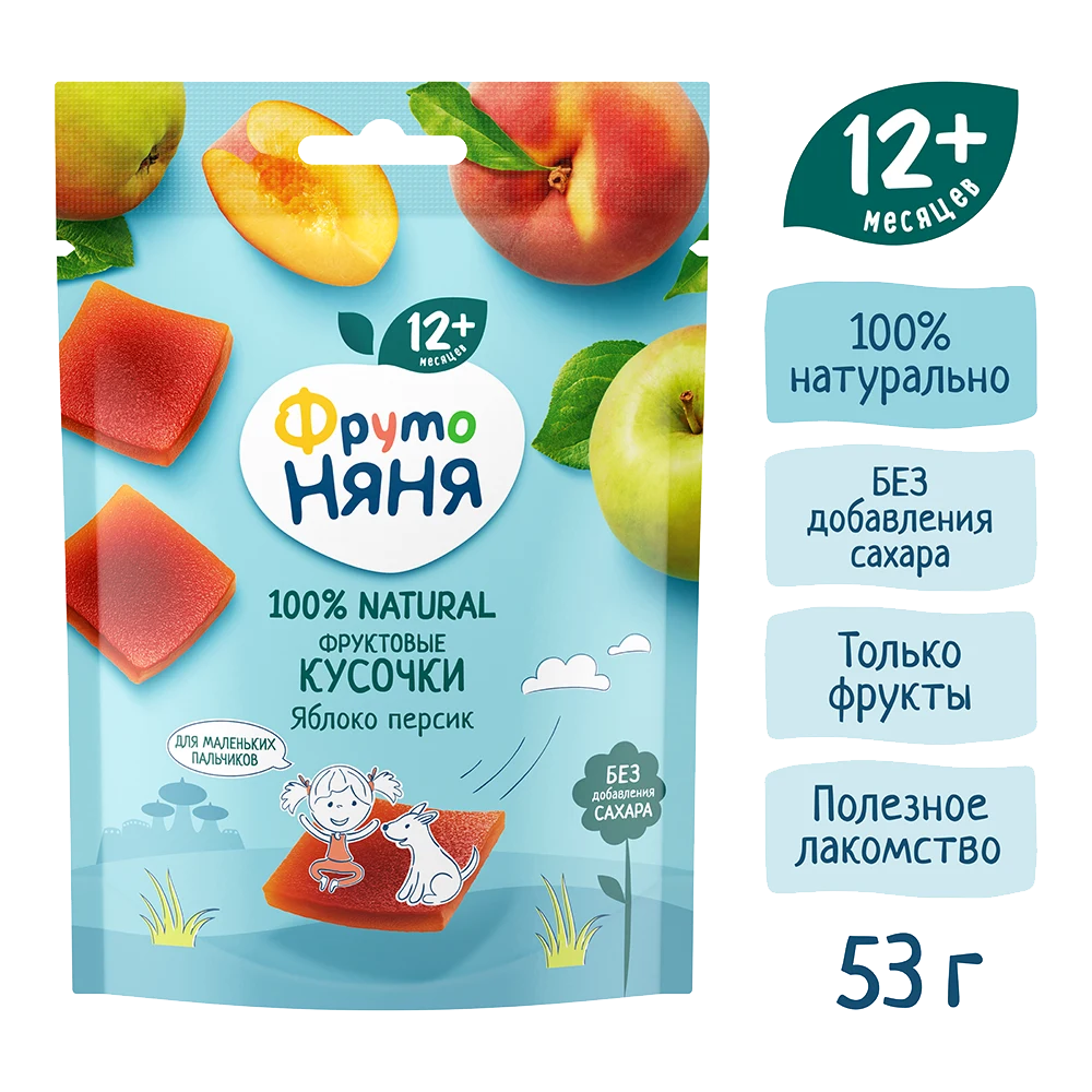 FrutoNyanya fruit pieces with apple and peach are a tasty and wholesome snack for toddlers aged 12 months and older. Their soft, jelly-like texture and gentle combination of sweet apple and aromatic peach make them especially appealing to young children.