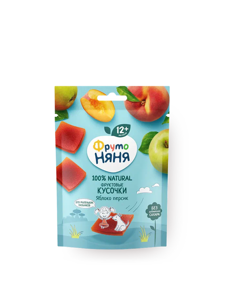 Fruit pieces “FrutoNyanya” made from apple — a natural fruit treat for children from 12 months. Made from apple juice and apple puree without added sugar, colorants, or preservatives.