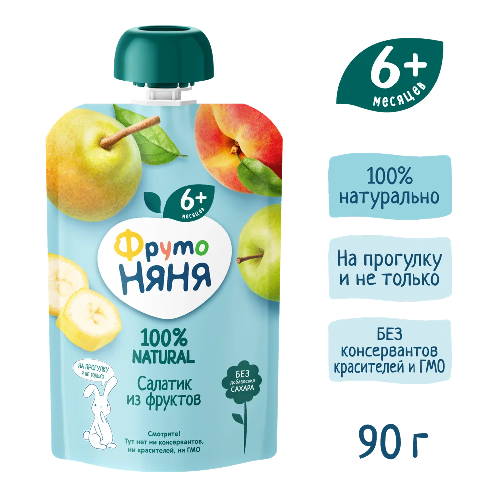 “FrutoNyanya” Fruit Purée “Fruit Salad” — a natural fruit purée for children from 6 months made from ripe bananas, pears, apples, and peaches. A healthy and tasty snack in a convenient soft pouch, ideal for online ordering with delivery in Dubai.