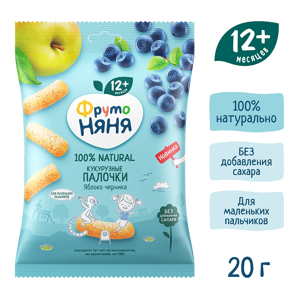 The product contains no added sugar — sweetness comes exclusively from natural apple and blueberry juices. The stick size is specially adapted for small hands, helping develop fine motor skills and encouraging independent eating.