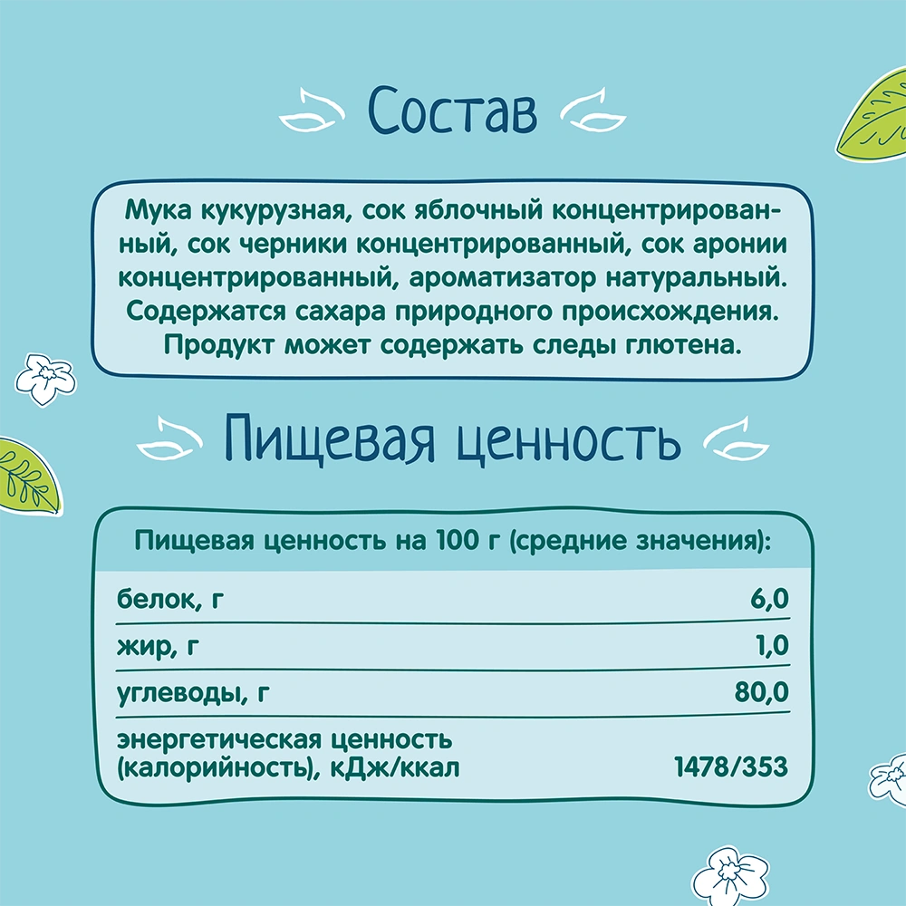 Corn flour, concentrated apple juice, concentrated blueberry juice, concentrated chokeberry (aronia) juice, natural flavouring.