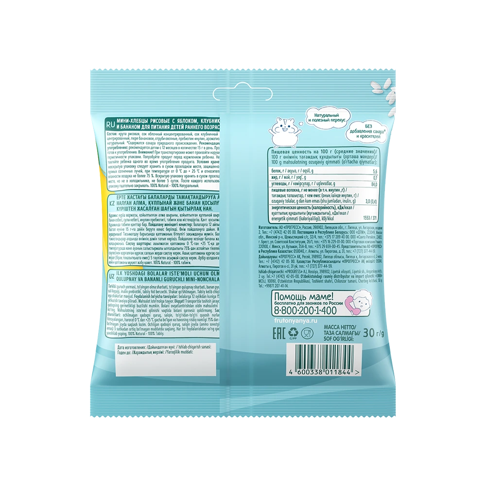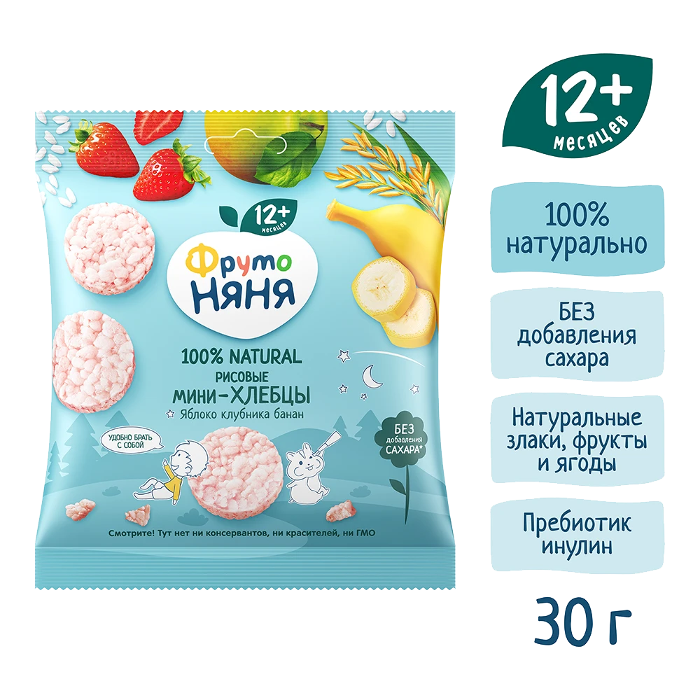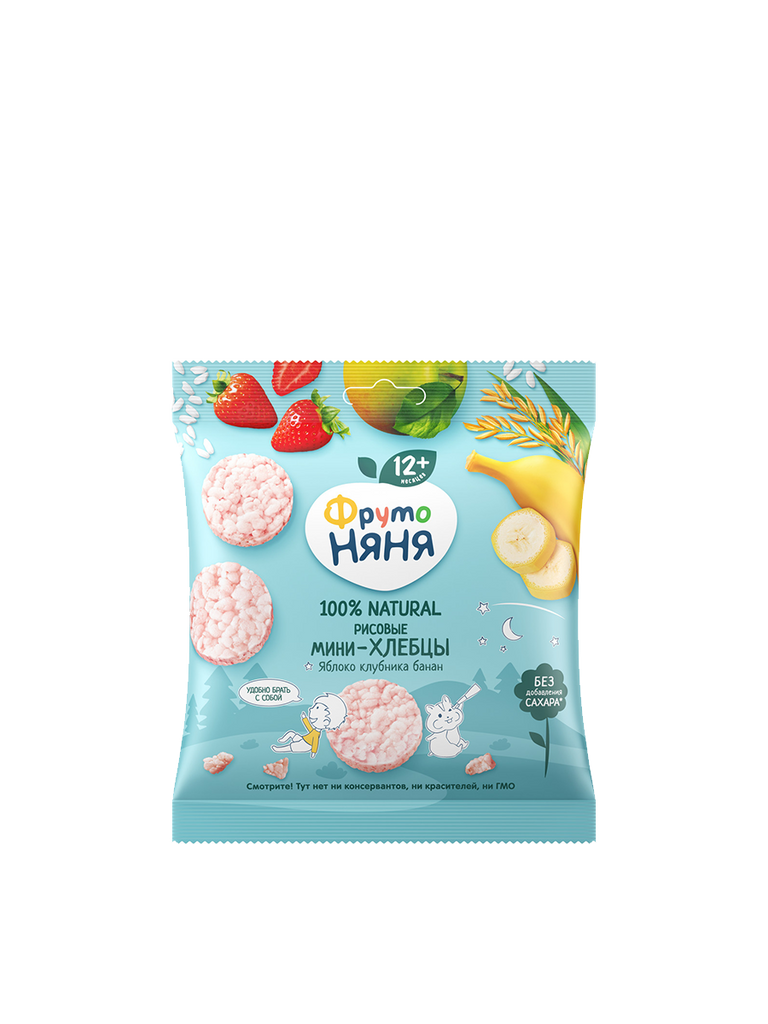 FrutoNyanya mini rice cakes with apple, strawberry, and banana are a tasty and nutritious snack for children aged 12 months and older. Made from natural rice grains with the addition of juices from ripe fruits and berries, they offer mild natural sweetness without added sugar.