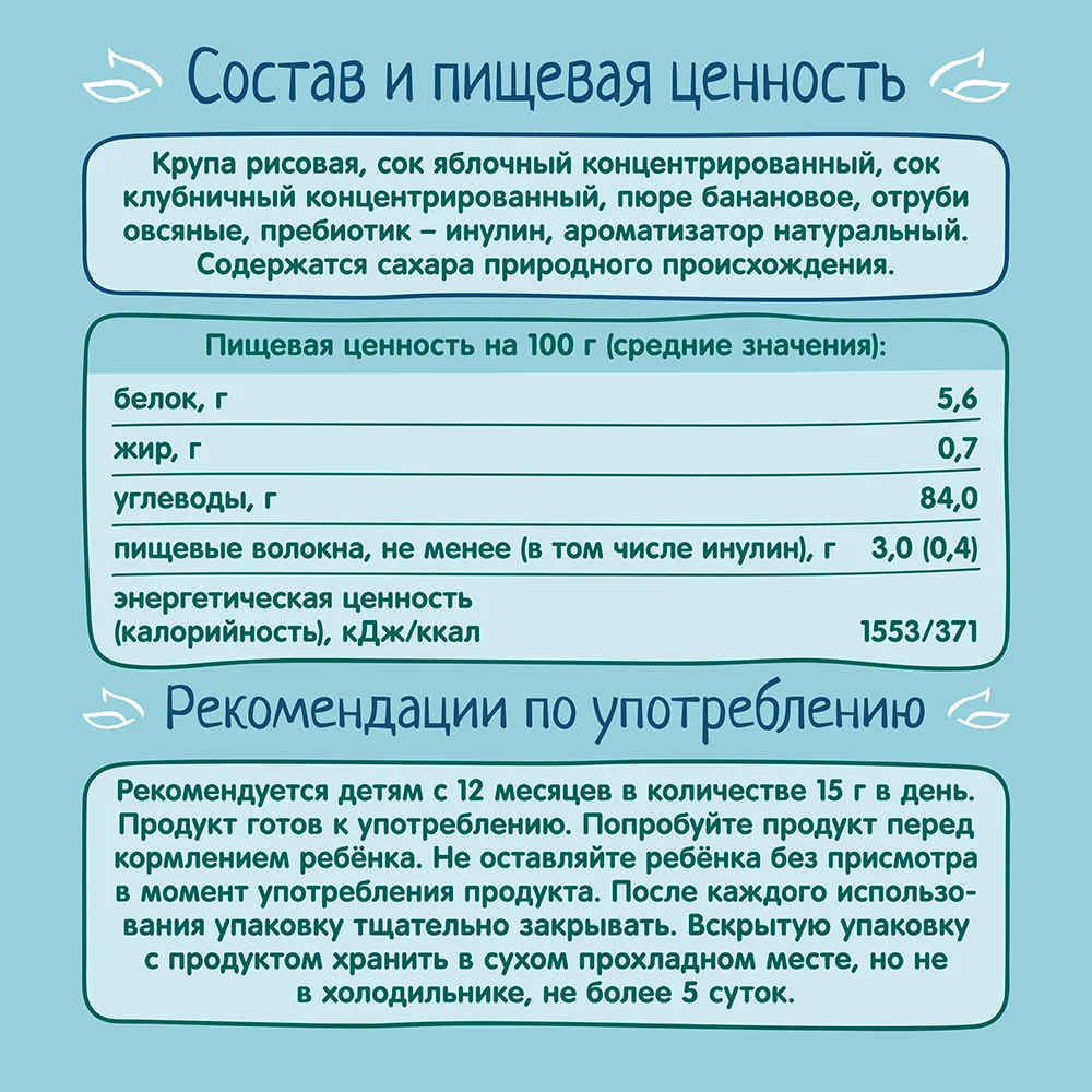 Rice groats, concentrated apple juice, concentrated strawberry juice, banana purée, oat bran, prebiotic – inulin, natural flavouring.