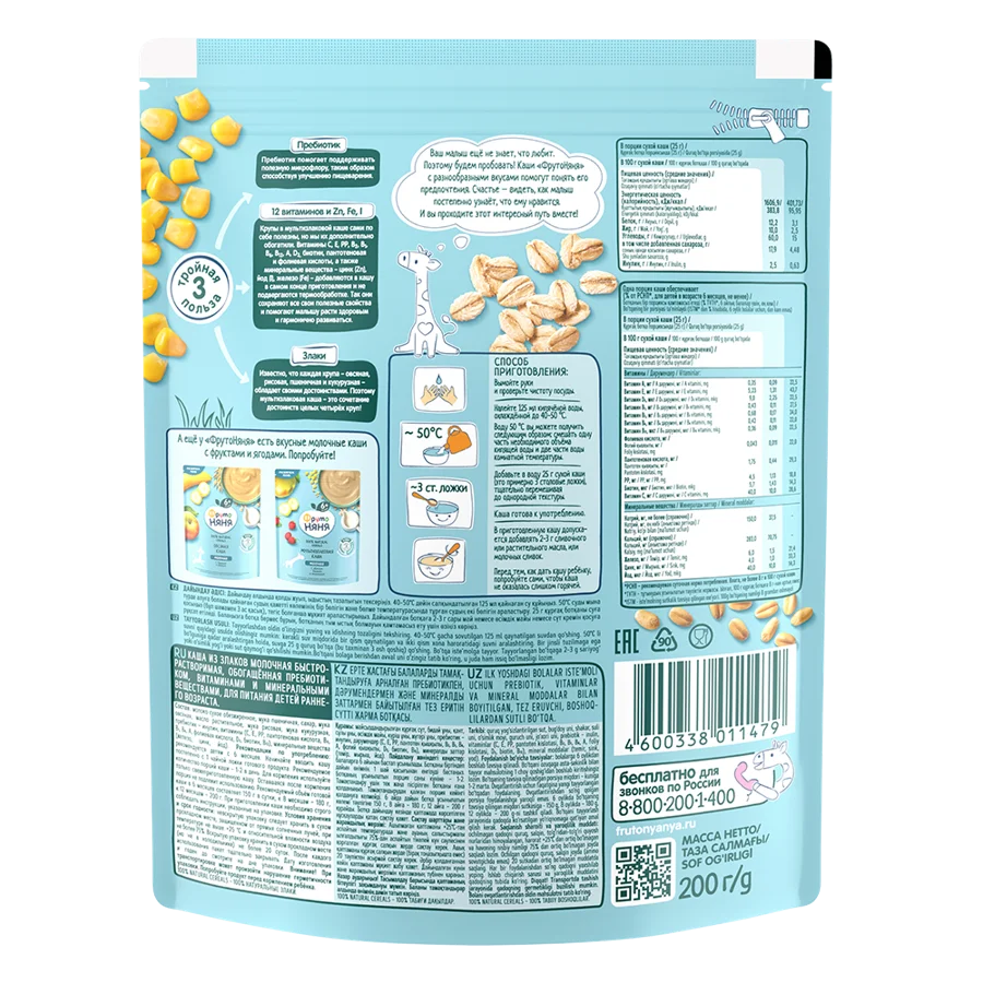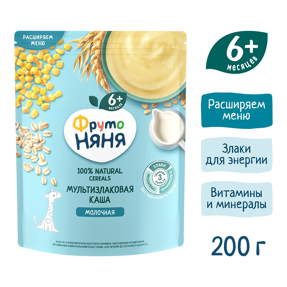 Multigrain milk porridge “FrutoNyanya” is specially developed for first complementary feeding and expanding the diet of babies from 6 months. The combination of wheat, oats, and corn provides an optimal balance of nutrients, while the smooth texture is gentle on a baby’s delicate digestion.
