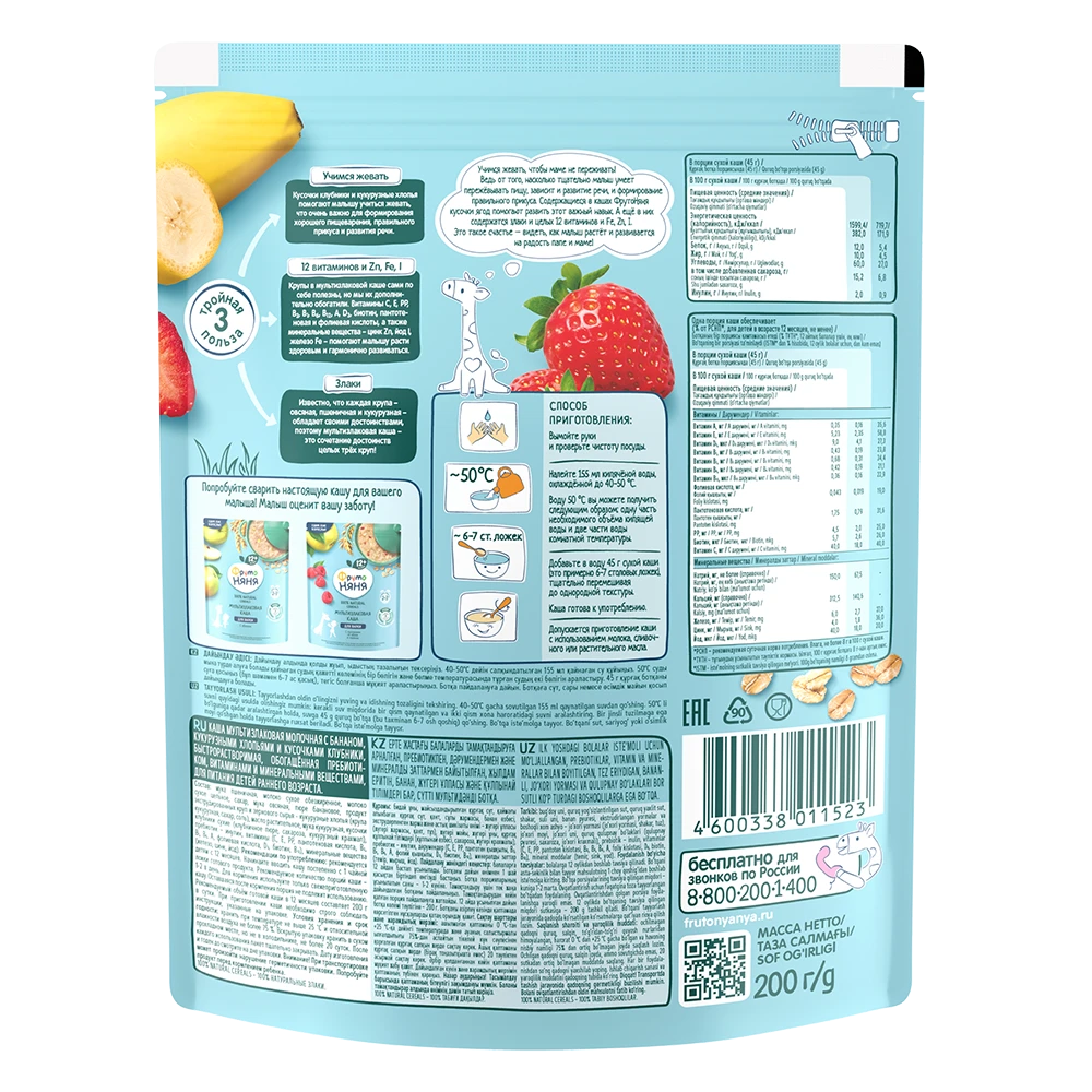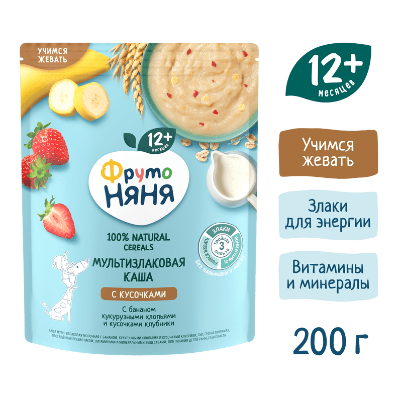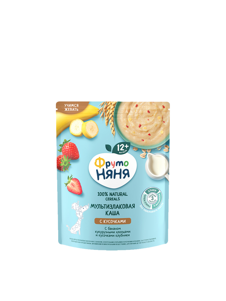 Dry milk multigrain porridge “FrutoNyanya” with banana, corn flakes, and strawberry pieces is specially created for children over 12 months. It combines the benefits of grains, fruits, and berries, while its texture helps develop chewing skills.